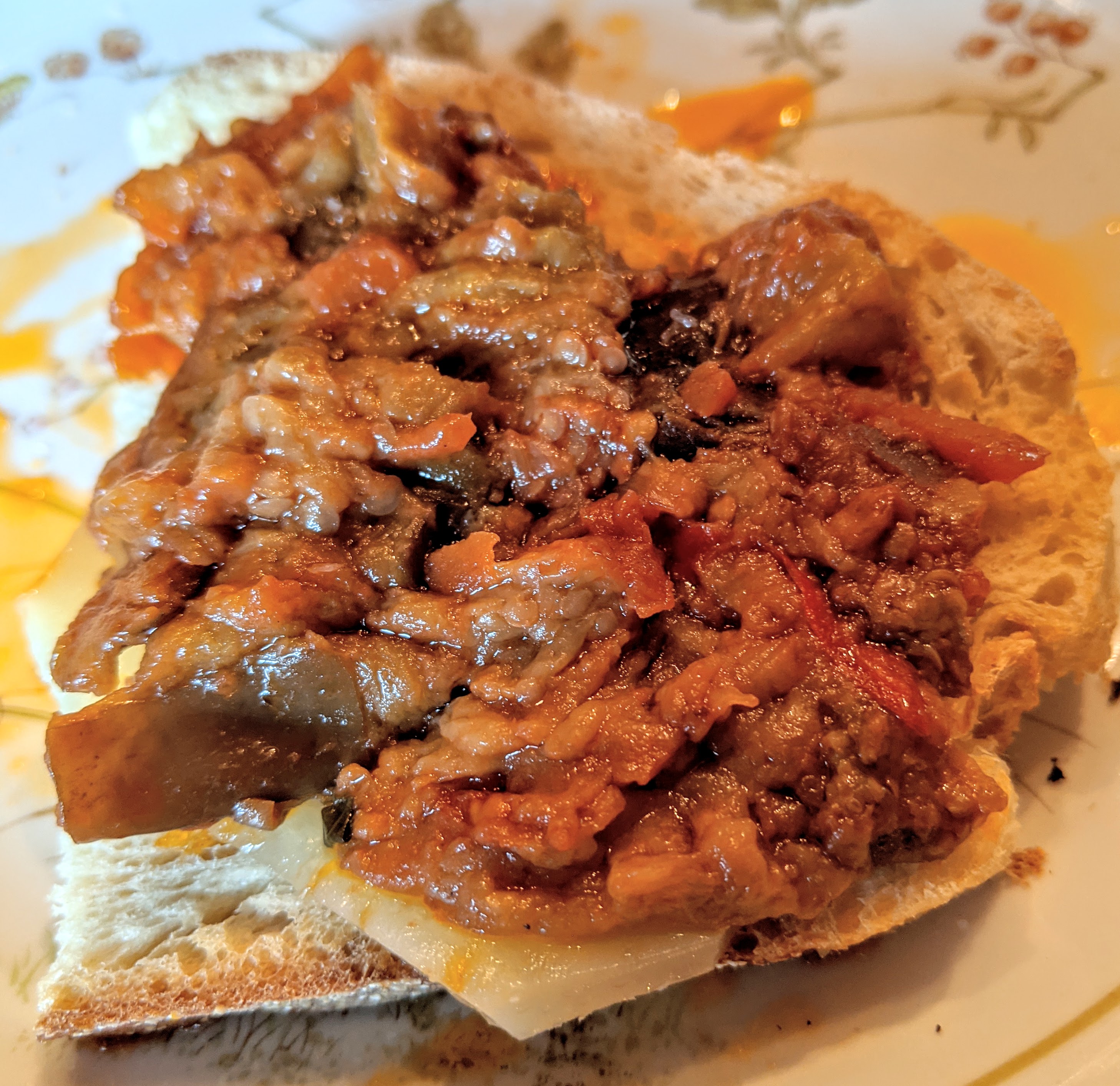 One of the easiest and least expensive ways to enjoy vegetables is to buy a jar of prepared vegetables in your local ethnic markets. In my case that would be a jar of fried Georgian vegetables (mostly eggplant, tomatoes and peppers) from Massis Bakery, an Armenian market in Watertown, MA.