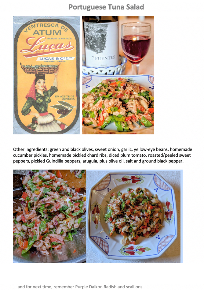 Lunches these days are usually relaxed and very gratifying. As I’ve written in the past, Lucas Ventresca Tuna Fish from Portugalia is one of my favorites, usually in a salad, replete with vegetables in various forms. Here is a concise summary of the most recent version.