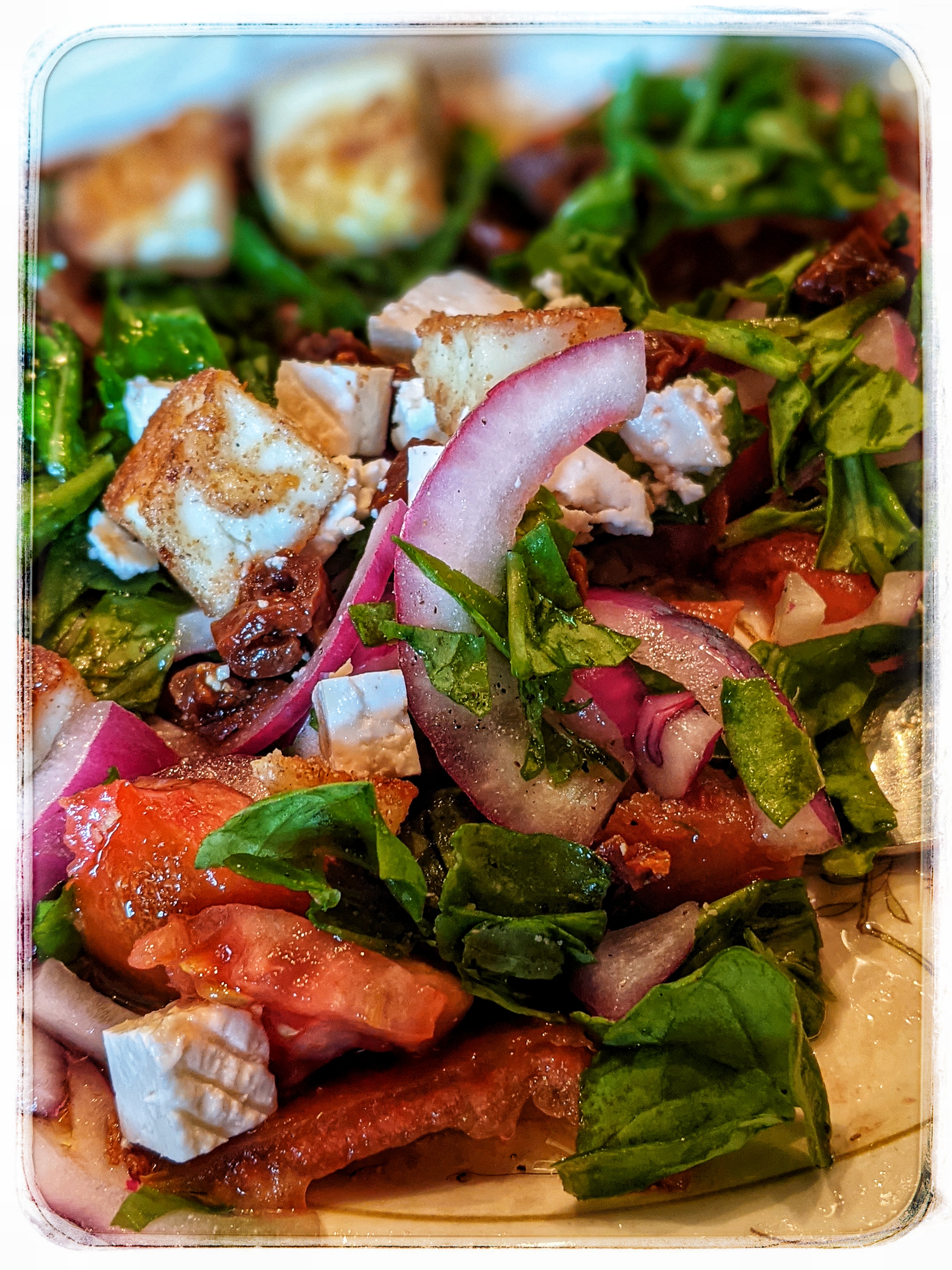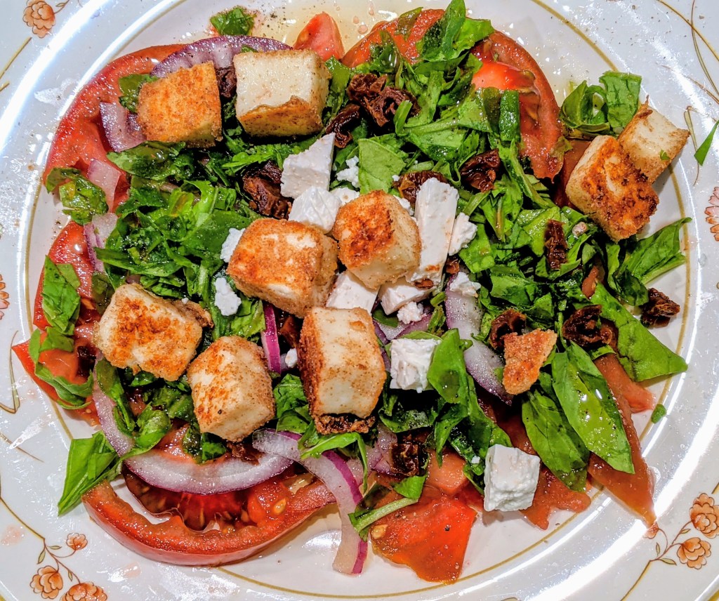The recipe is simple: thinly-sliced tomato, arugula (torn into bite-sized pieces), sliced red onion, olive oil, salt, and pepper, and some cheese. It’s written for ricotta salata, but also suggests feta cheese as an alternative. I used some Israeli feta (from Trader Joe’s), along with several cubes of Halloumi, which were dusted in rye flour and sautéed in olive oil. I also added a few splashes of Portuguese red wine vinegar for acid. The results were excellent, especially with the Cotes-du-Coast Rhône-style white wine for accompaniment.