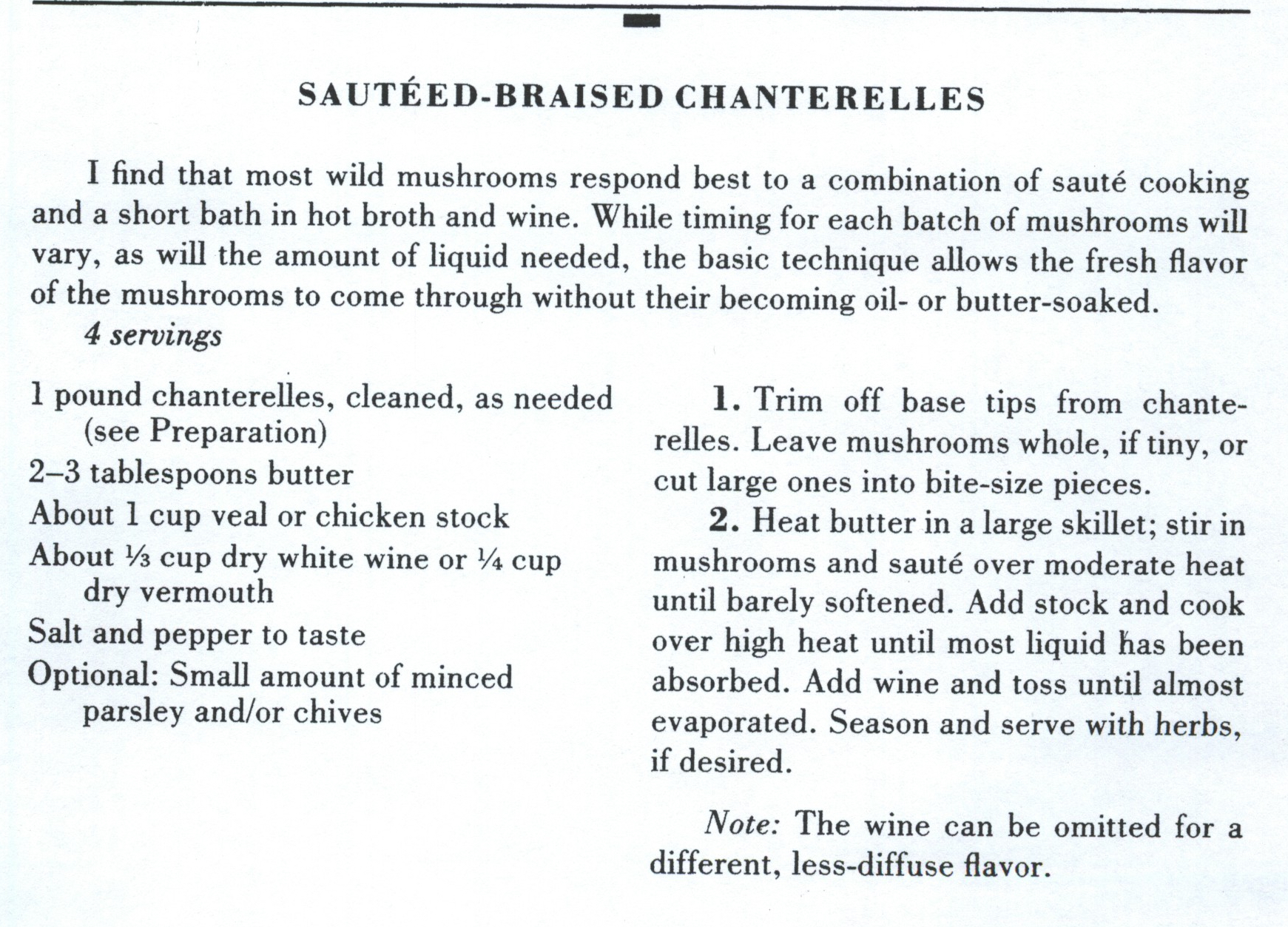 I have referred to this book occasionally over the many years it has been on my shelf. It was invaluable with how to cook chayote squash, celeriac, collards, jicama, mustard greens, and other obscure ingredients I come up with. Then, one day about 12 years ago, I tried her simple directions for cooking chanterelles, another mushroom with which I had much difficulty. That was a game-changer, and a technique I used ever since.