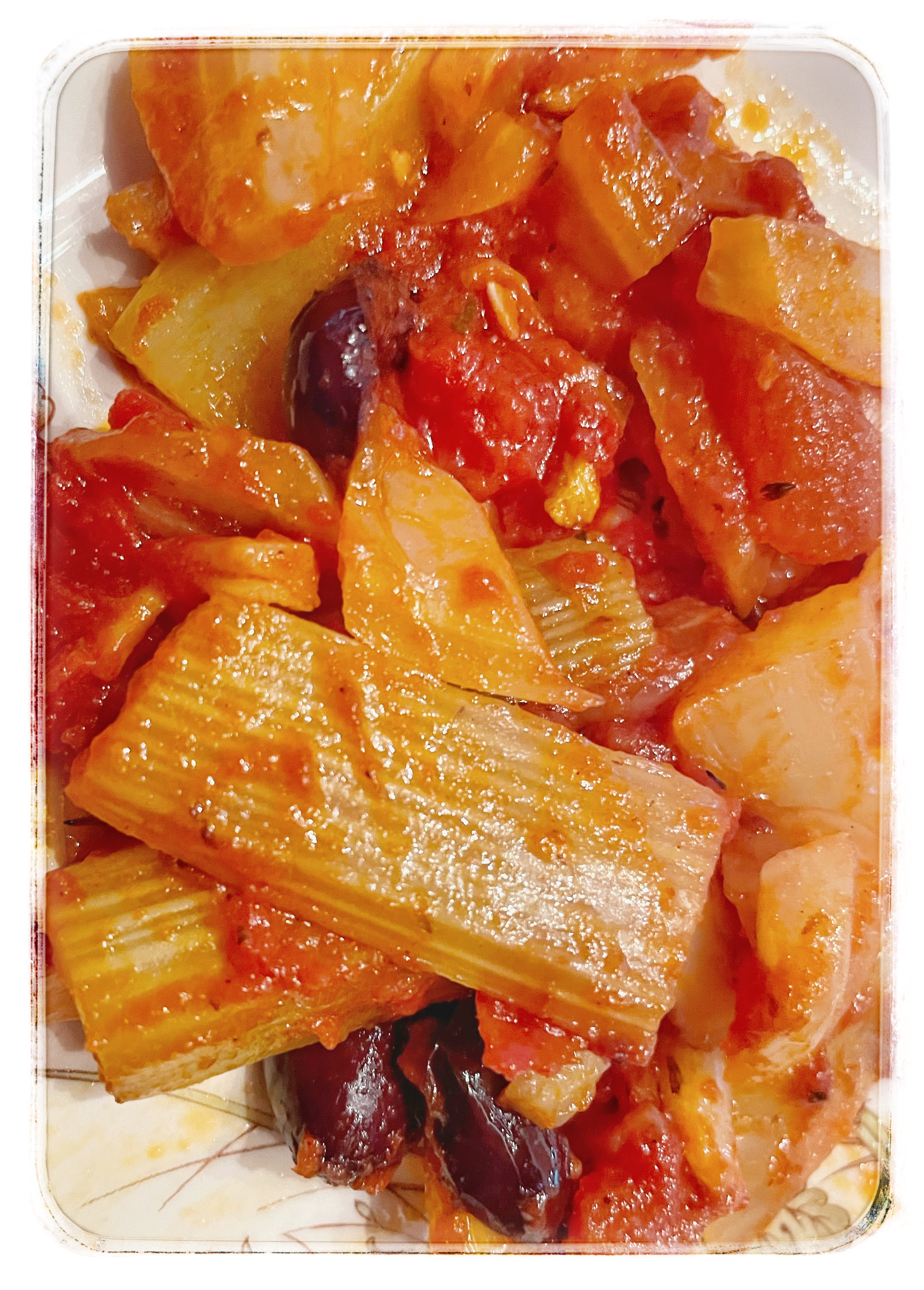 As a side dish, I braised chopped fennel, celery stalks (cut 2-3 inches long), chopped tomato, and pitted/chopped Kalamata olives in another sauté pan. The results: