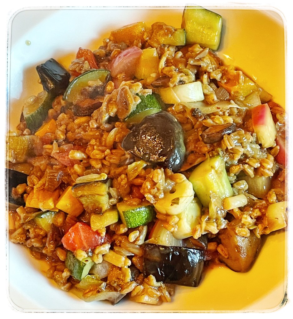 I think Farro is a superb grain. Substantive, flavorful, just chewy enough, and it goes with almost everything. Last week I cooked some with a mess of vegetables for dinner, and it was great. Here is my list of ingredients: