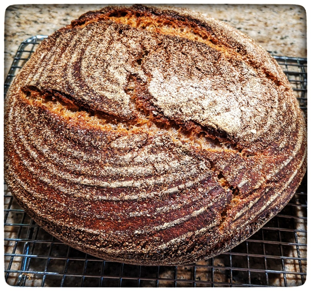 A package of Bob’s Red Mill wheat germ completed the necessary supply items, and I was ready to bake. Most of the methodology for this was the same as the Tartine bread approach I’ve used for years. Two aspects were different and needed to be noted. The hydration was higher for this bread (85% vs. the 76% I was used to), and his instructions maintained a higher heat longer when baking the breads.