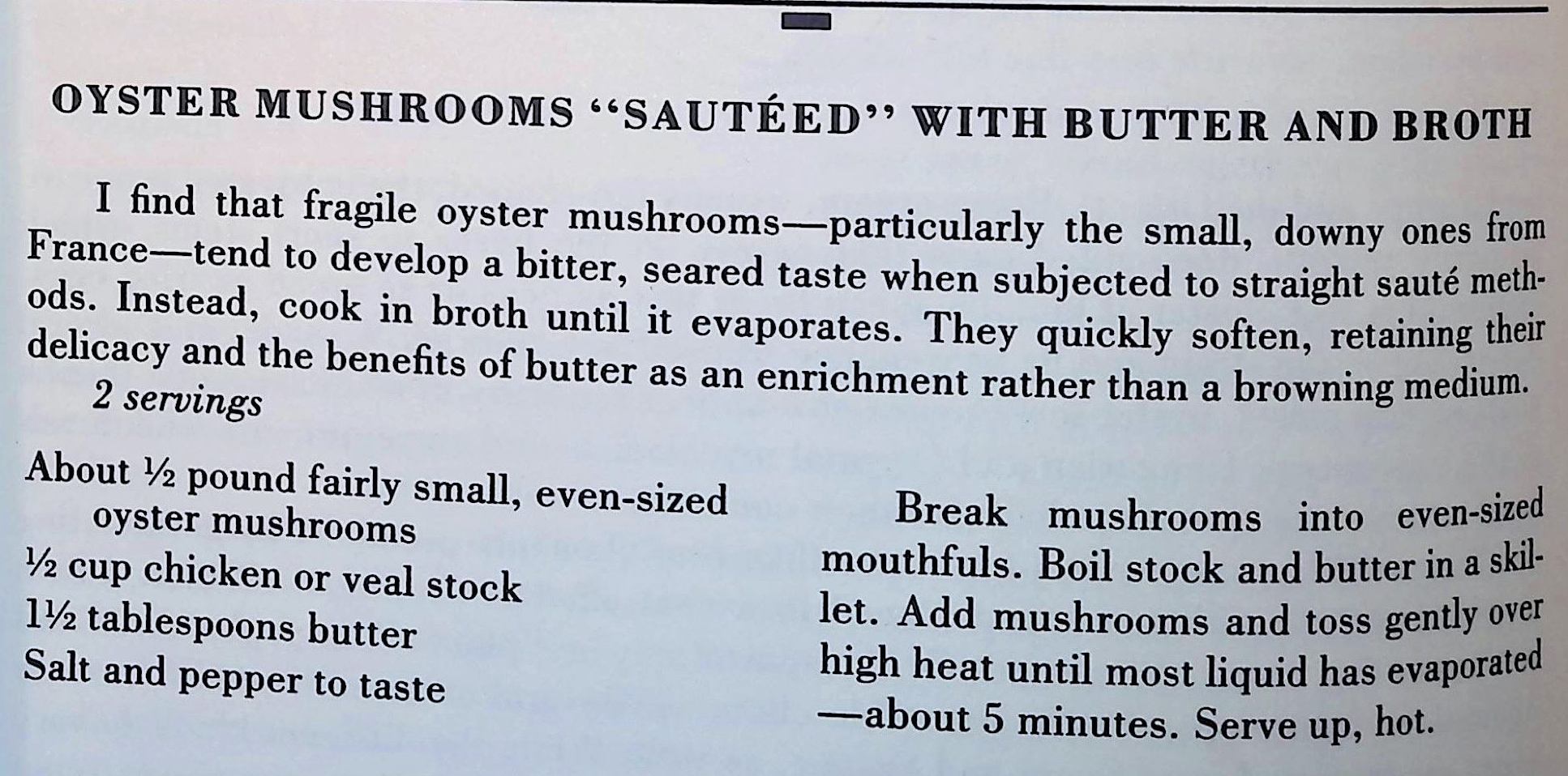 A pound of oyster mushrooms is a lot of mushrooms, so after tearing them into smaller pieces, I took out a large sautéuse, added a pint of vegetable stock plus 3 Tbs. of sweet butter, brought it to a boil, and cooked it on high heat until much of the liquid was gone. I took out a few tablespoons of the buttery liquid to add to the sauce, before all the moisture evaporated from the pan. Next, I continued to sauté the mushrooms — which now were glistening with butter in the pan — until they were lights browned and tasty.
