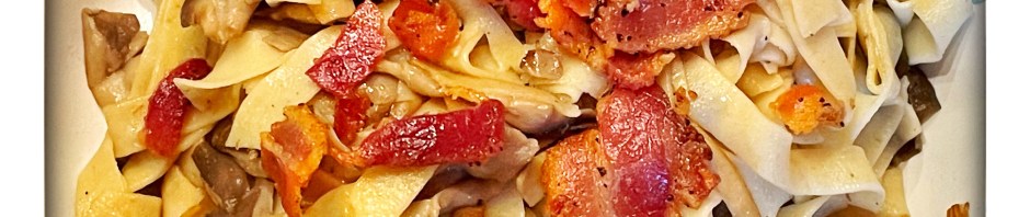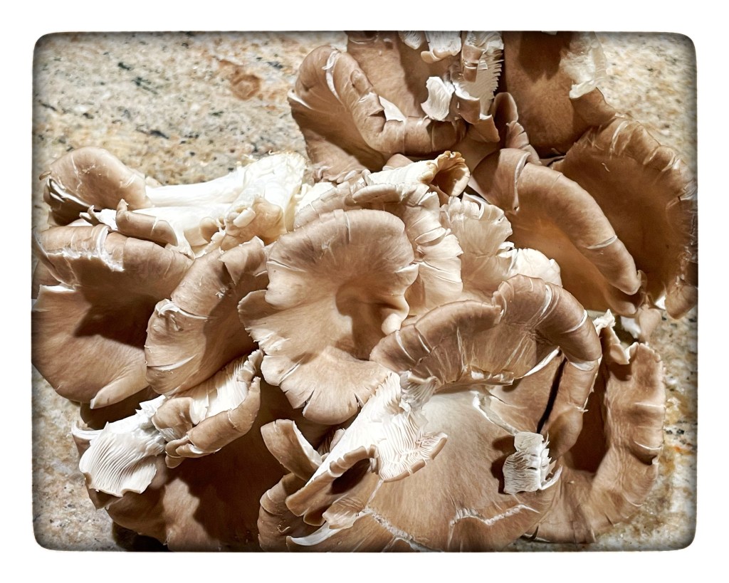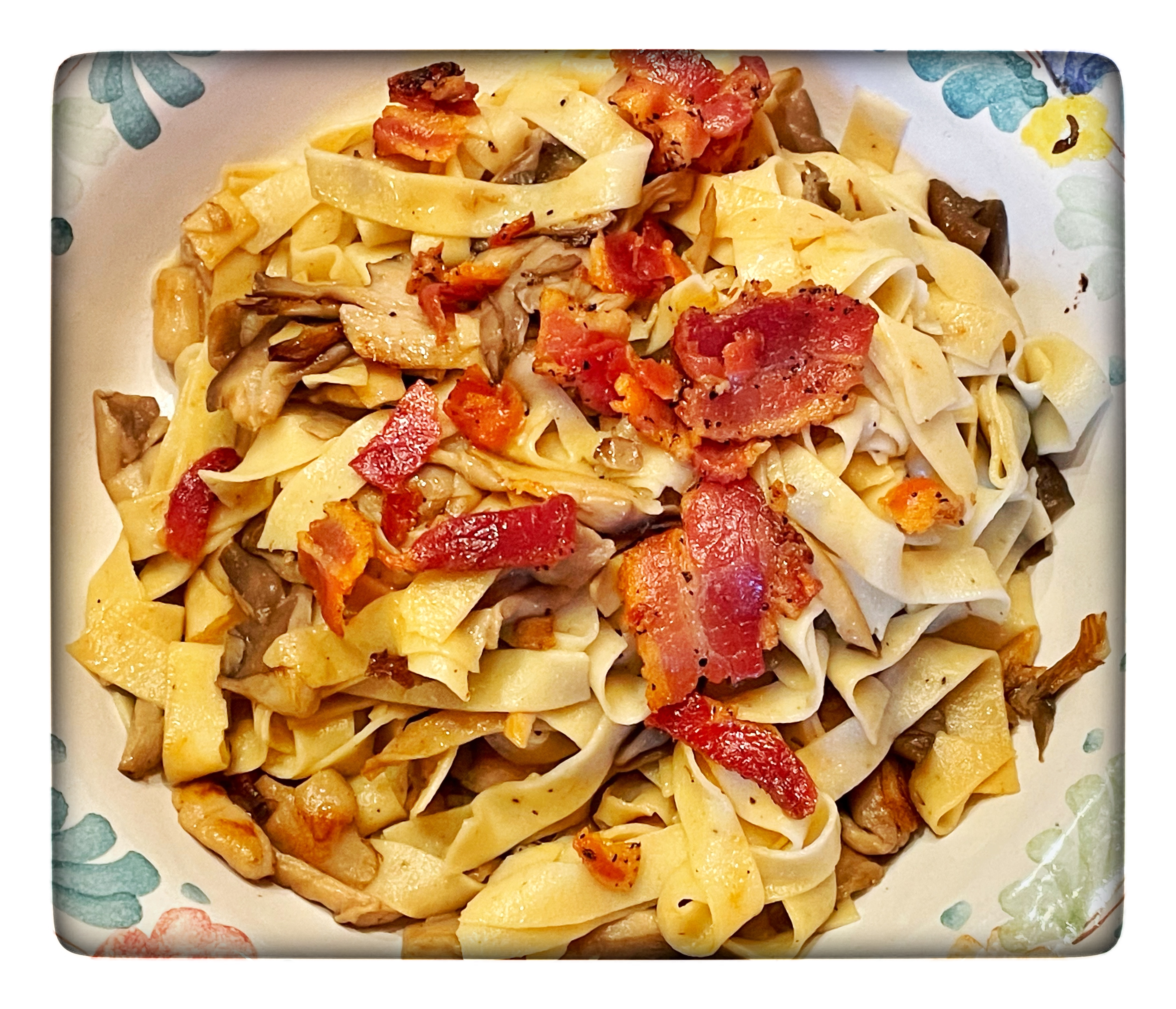 Once again, I enjoyed a meal featuring homemade pasta and marvelous, fresh oyster mushrooms. I was feeling a bit bereft during August because my source for top-notch mushrooms was on vacation. Elizabeth Almeida, the entrepreneur and founder of Fat Moon Farm in Westford, MA, had explained to me that oyster mushrooms like it cool, so they don’t do well during our hot Augusts, which is why she and her family take vacation then. They take a hiatus in the mushroom growing activities, so I had to wait another month to repeat the success I had in June, using my newly-discovered technique for sautéeing them first in a broth with butter, before adding them to pasta.