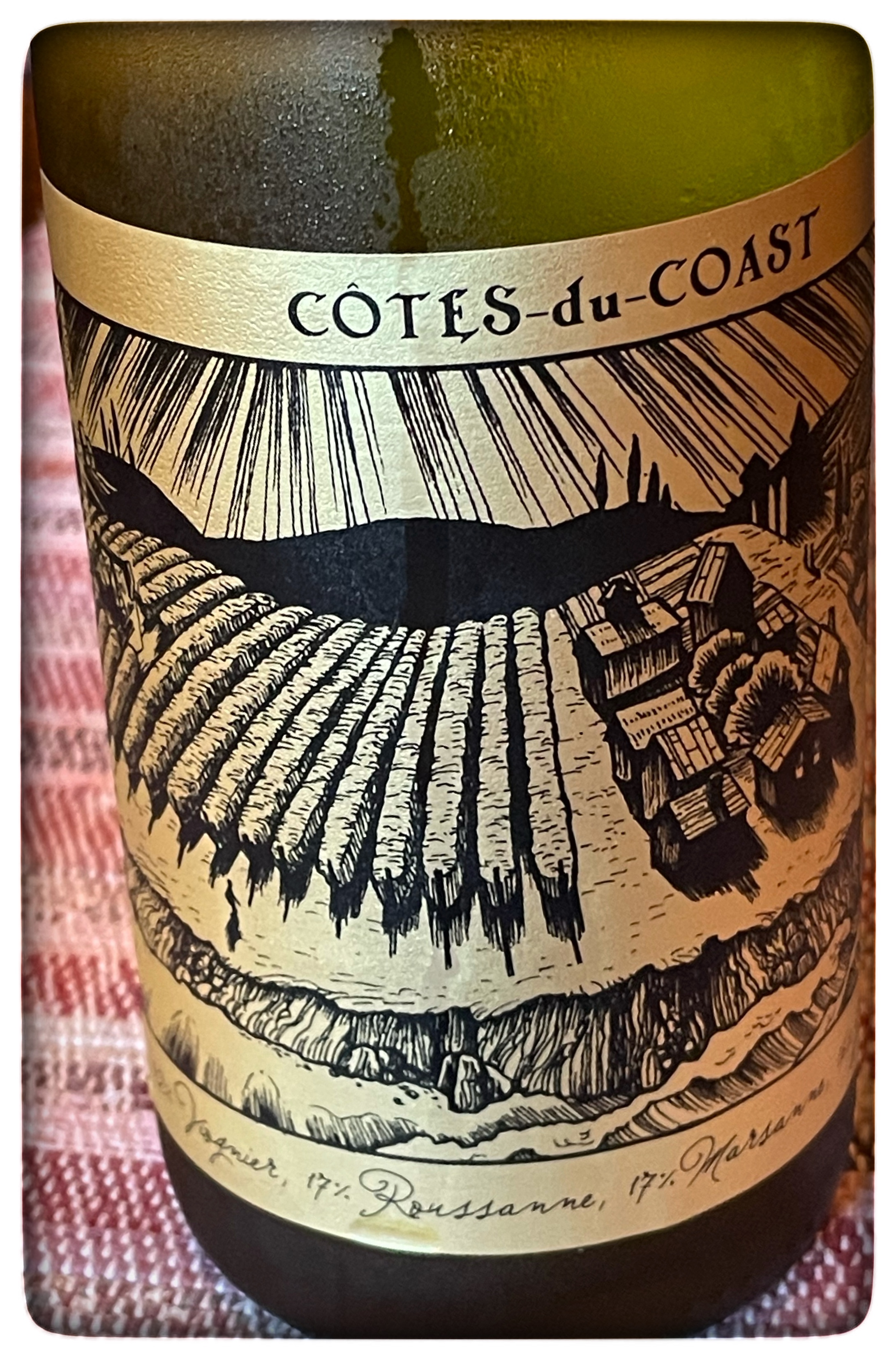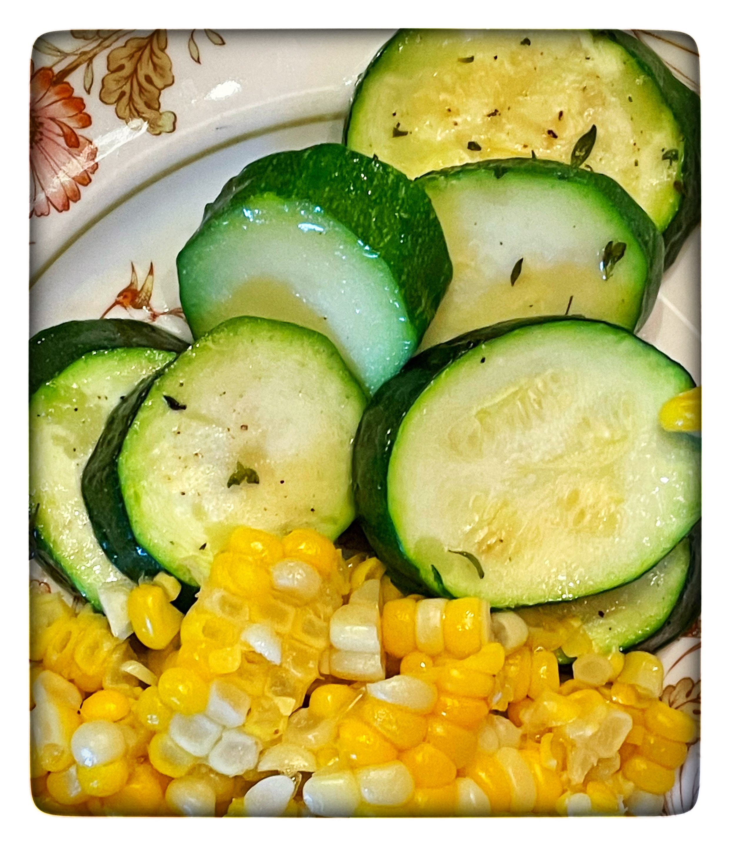 In the meantime I had sautéed the pancetta with a little olive oil until it was crispy, and I set it aside to reheat and add to the top of the pasta. I made a small side dish with zucchini and corn off-the-cob from end-of-the-season Harper’s Farm Butter and Sugar corn. As you know, fresh pasta cooks in just a few minutes, so I added the fettuccine to the sautéeing mushrooms, and cooked them together for a few minutes. An open bottle of a Rhône-style white wine from Sans Liege completed the table. We each had a full serving and ate it all.