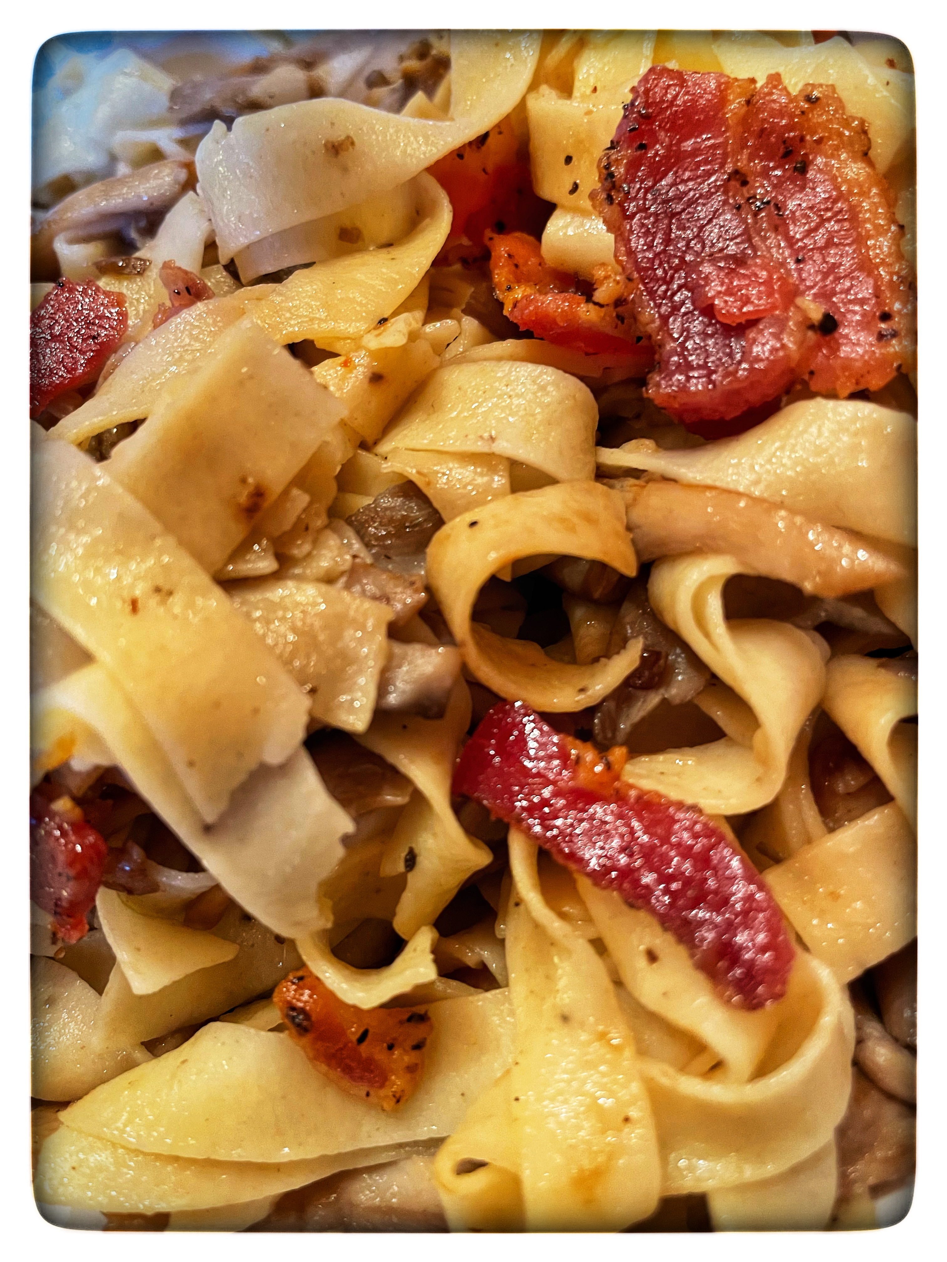 We had a new chunk of pancetta in the refrigerator, so I sliced some of that, chopped the pieces coarsely, and proceeded with the mushroom preparation. Here, again, is the simple recipe for that process: