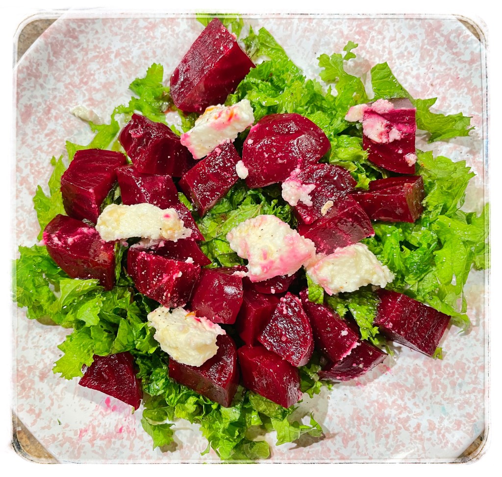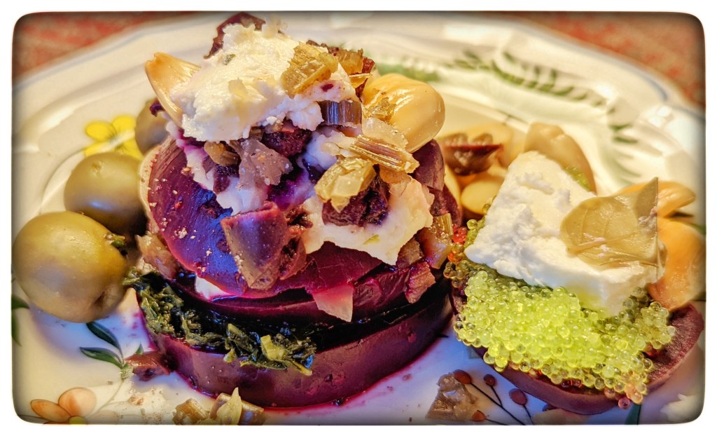 Another Beet Salad – with almonds, olives, greens, pickled Swiss Chard ribs, goat cheese, tobiko, and candied ginger