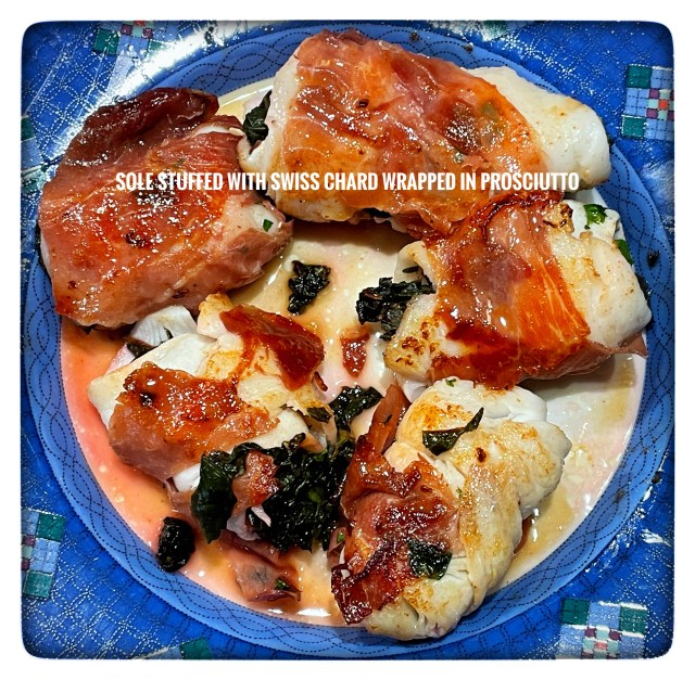 We had some uncooked fresh sole fillets from a recent dinner, so I decided to make a simple, quick lunch by wrapping them in prosciutto and sautéing them in a nonstick pan. This time I substituted Swiss Chard for Arugula, with no loss of quality. For a grand total of eight minutes prep and cooking, it was a very high return on investment.