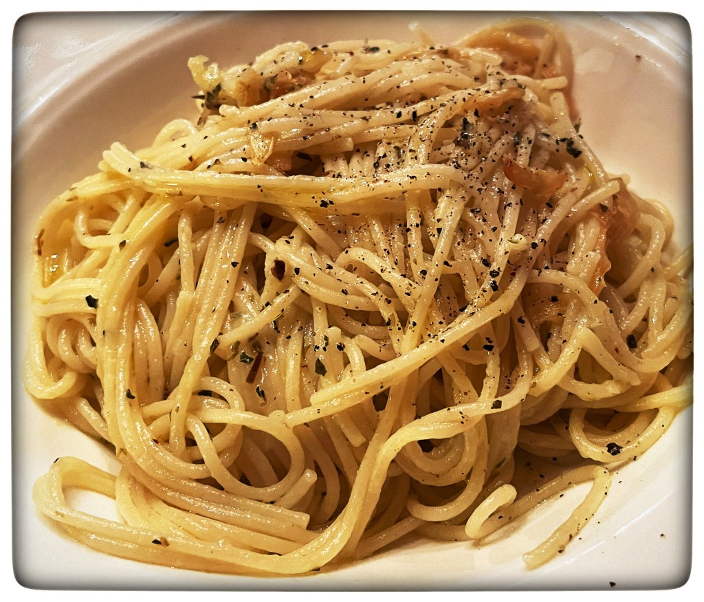 When I am cooking just for myself, I can load up on sharp and spicy ingredients that my wife won’t go near. Such was the case this weekend when I made Spaghettini Italiano with Garlic, Chili, Oregano & Parmesan. Here’s the recipe from the Internet: https://ciaochowbambina.com/spaghettini-italiano-with-garlic-chili-oregano-parmesan/