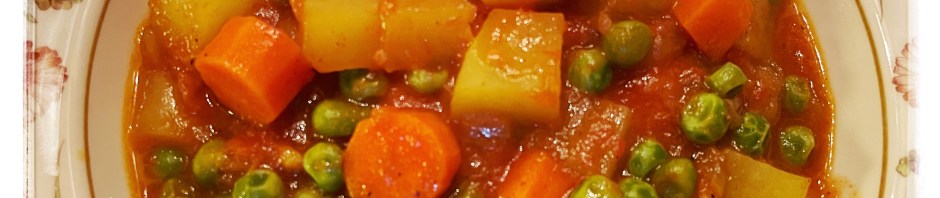 Let’s begin with a recipe my wife learned from the Library Cookbook Club. It was called Village-Style Carrots with Potatoes and Peas, a name that makes it very easy to decide if you want to make it, and if so, to prepare the dish for the table..