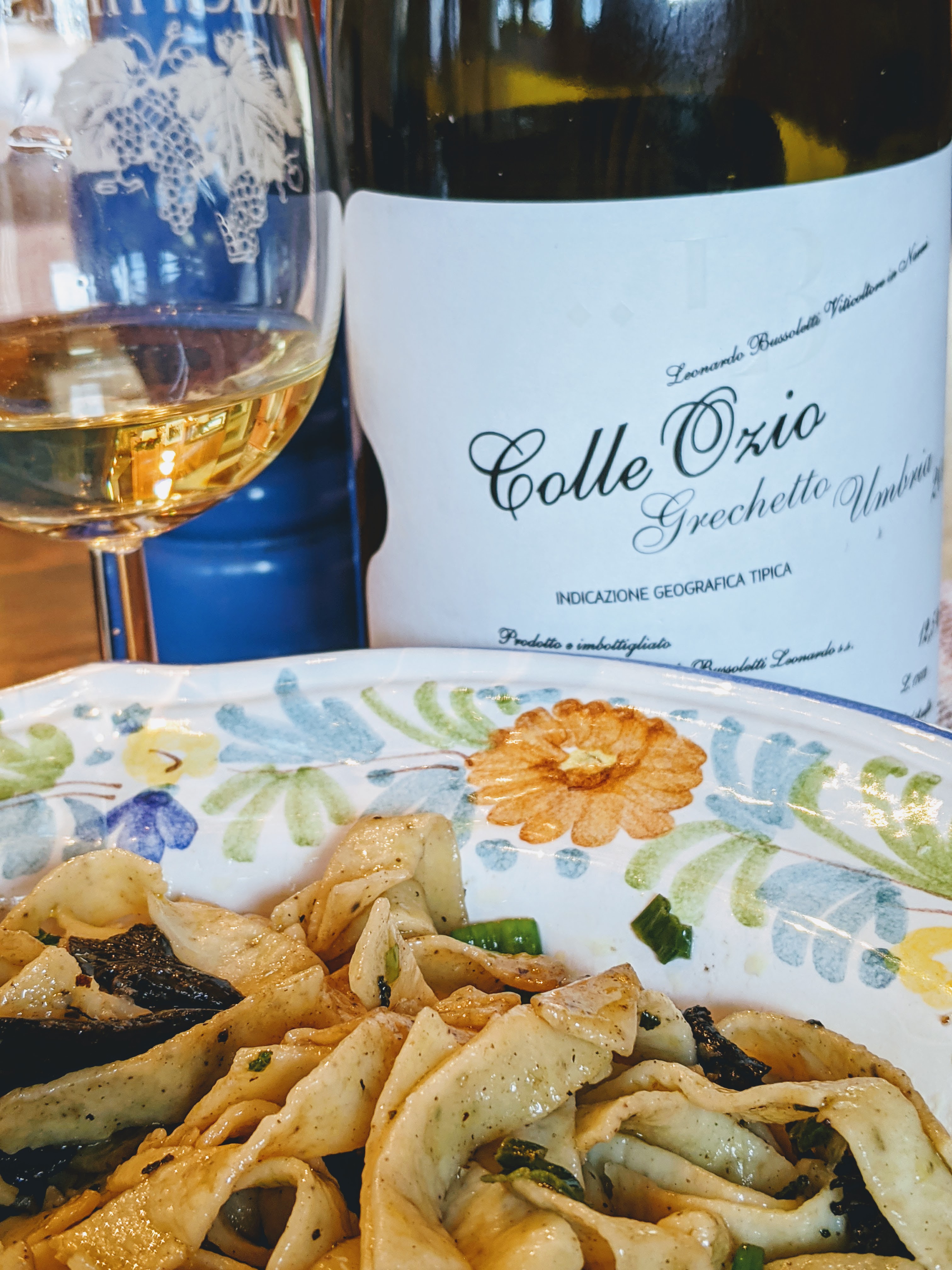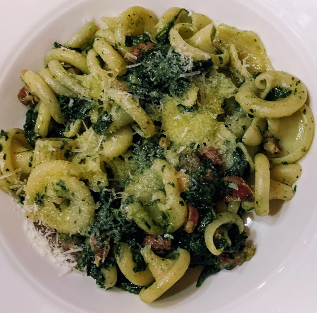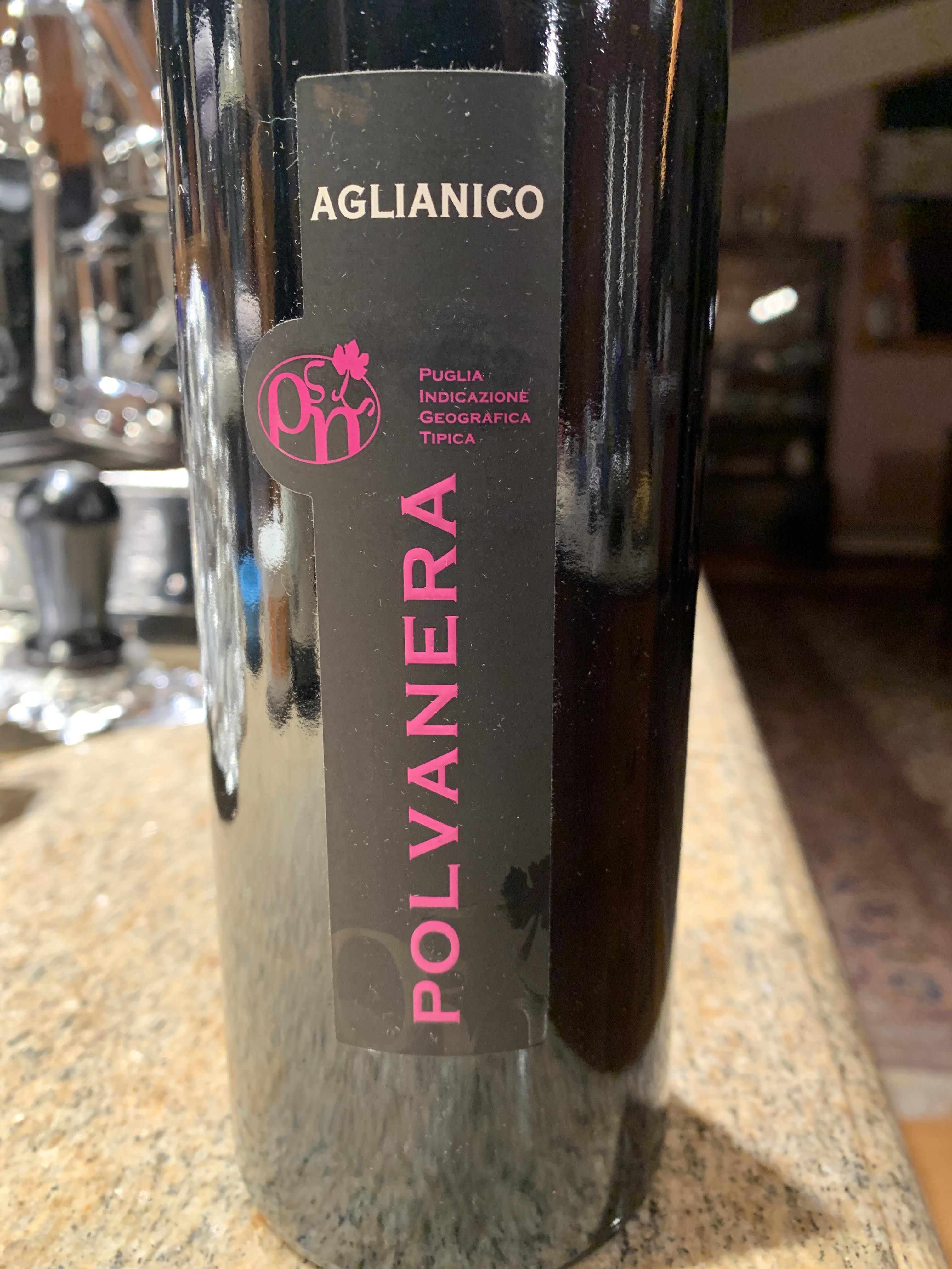 This meal was made from two different shapes of short pasta, crisped-up bits of pancetta, and tender cavolo nero. It’s a pretty typical dish in Puglia, so my wine choice was Polvanera‘s Aglianico. It’s one of Jan D’Amore’s imports, and I had visited the winery with Aaron on our trip in 2012. Excellent match.