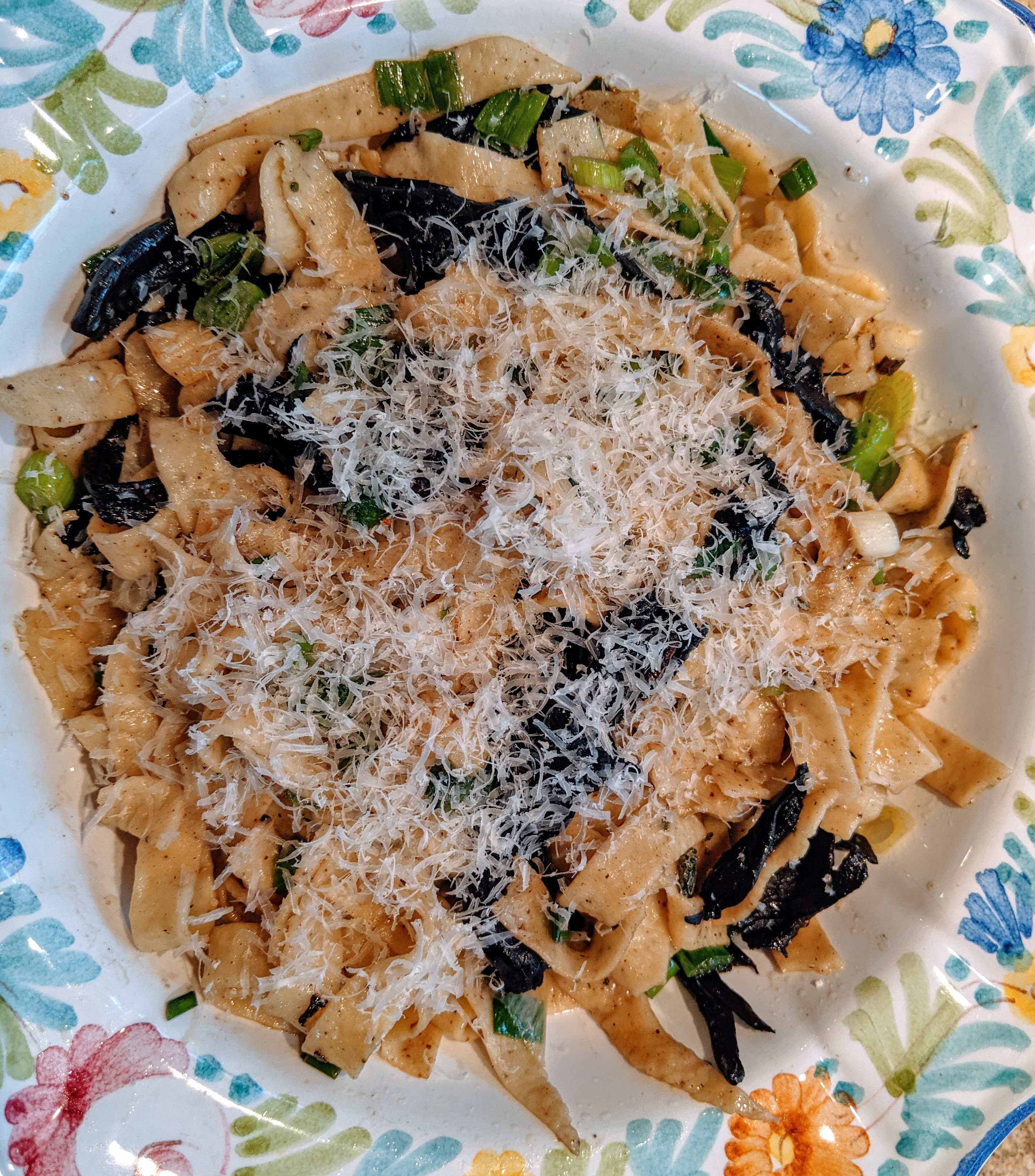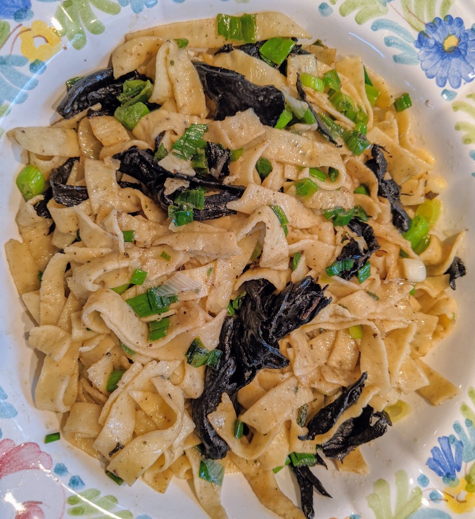 Black is also beautiful in food. Barbara had used our spice grinder to grind a lot of black peppercorns for something she made, and we had a good bit left over. It was a great opportunity to make black pepper fettucine, with my usual recipe of “00” flour, salt, egg and a little olive oil — plus lots of ground pepper for zestiness. I was excited to find fresh Black Trumpet Mushrooms while shopping at Idylwilde Farms, which were sautéed briefly with some chopped scallions and paired with a Grechetto from Umbria.