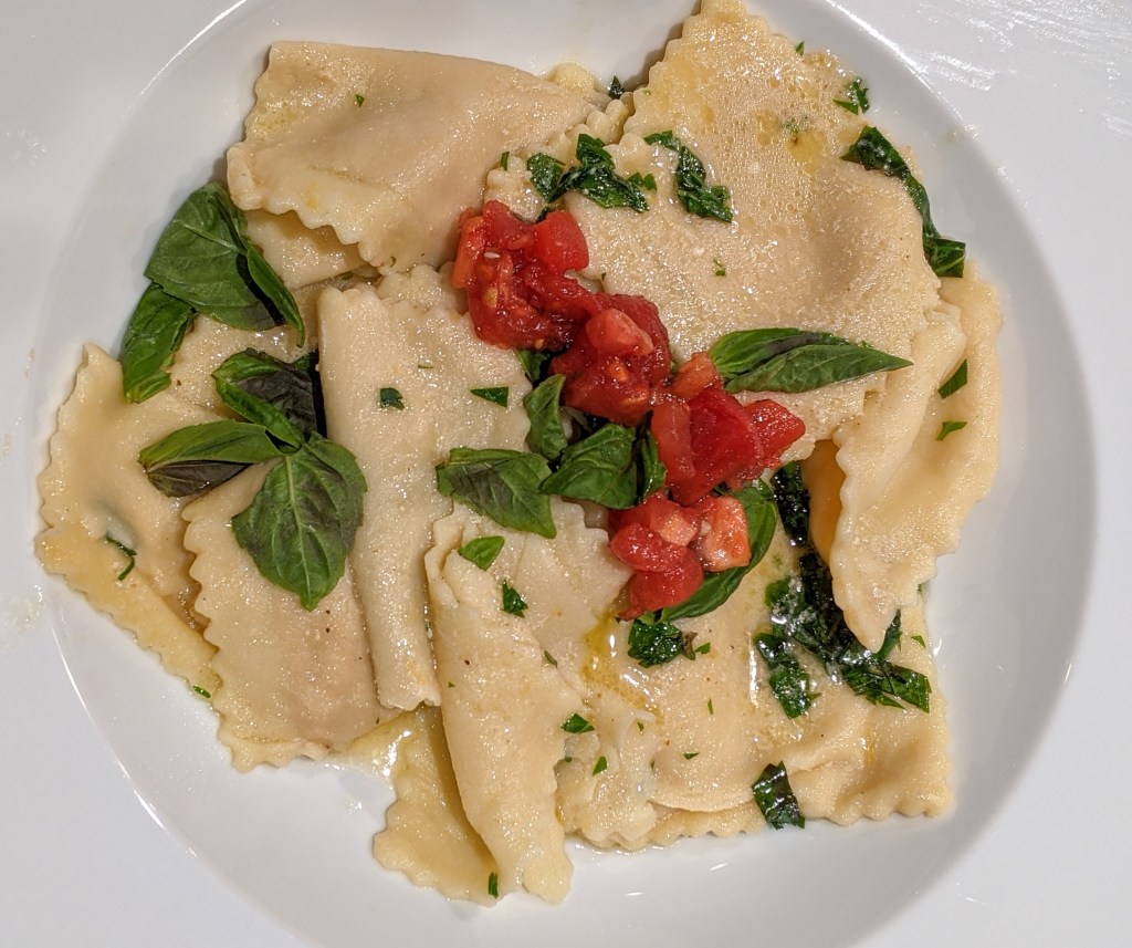 A simple butter and olive oil sauce with basil and parsley was sufficient, although I embellished mine with chopped, peeled, seeded plum tomato with a touch of balsamic vinegar.