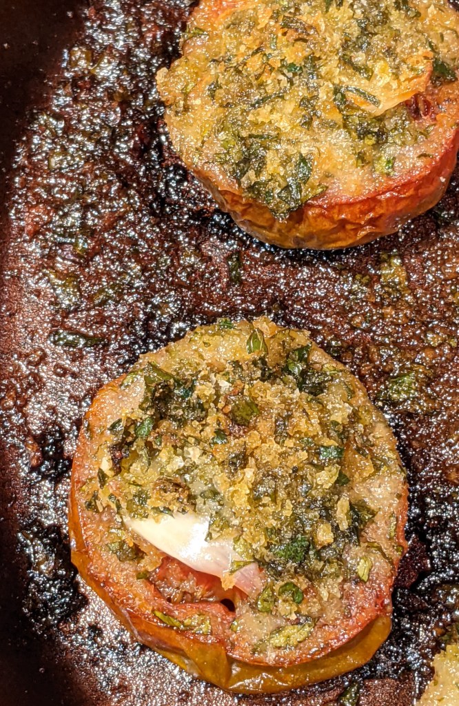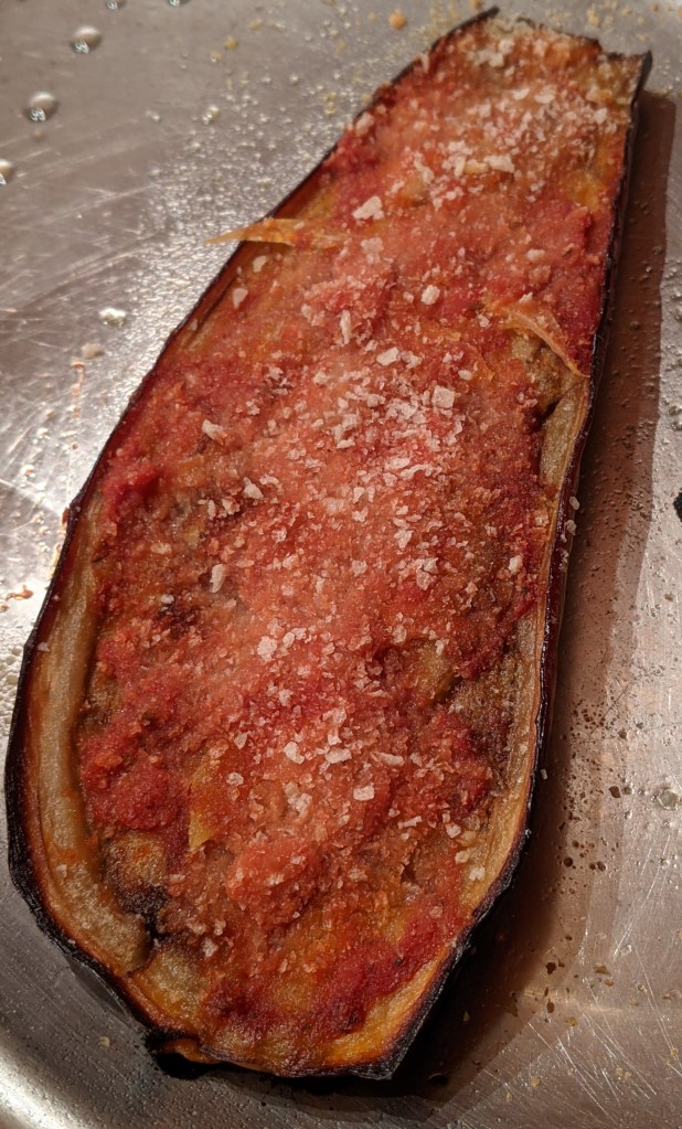 Less attractive, but equally tasty was the vegetable course — Baked graffiti eggplant halves, topped with garlic slices, tomato sauce and bread crumbs.