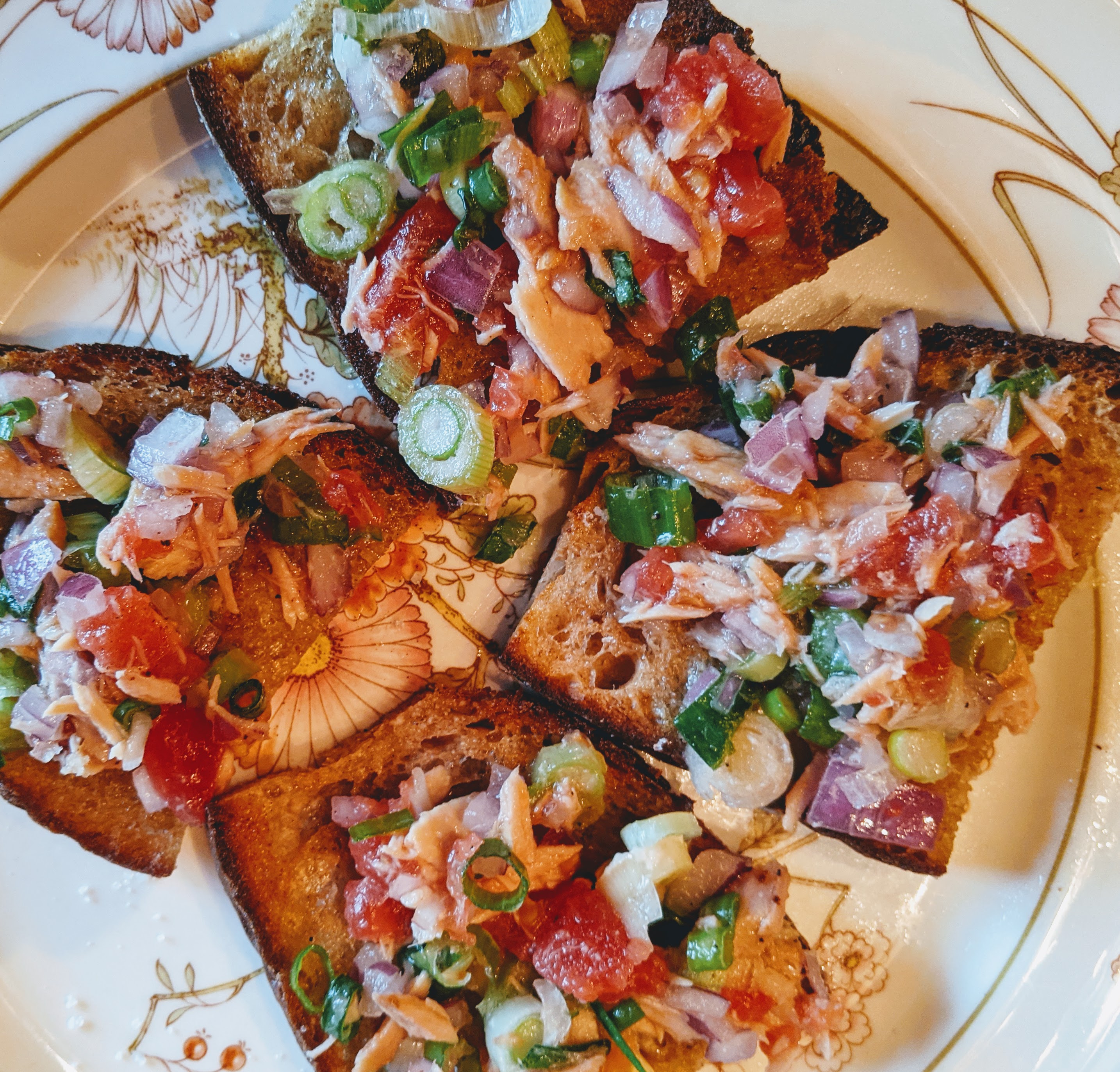 Pan-Fried Sourdough, Lucas Canned Tuna, Red Onion, Scallions, and Plum Tomato
