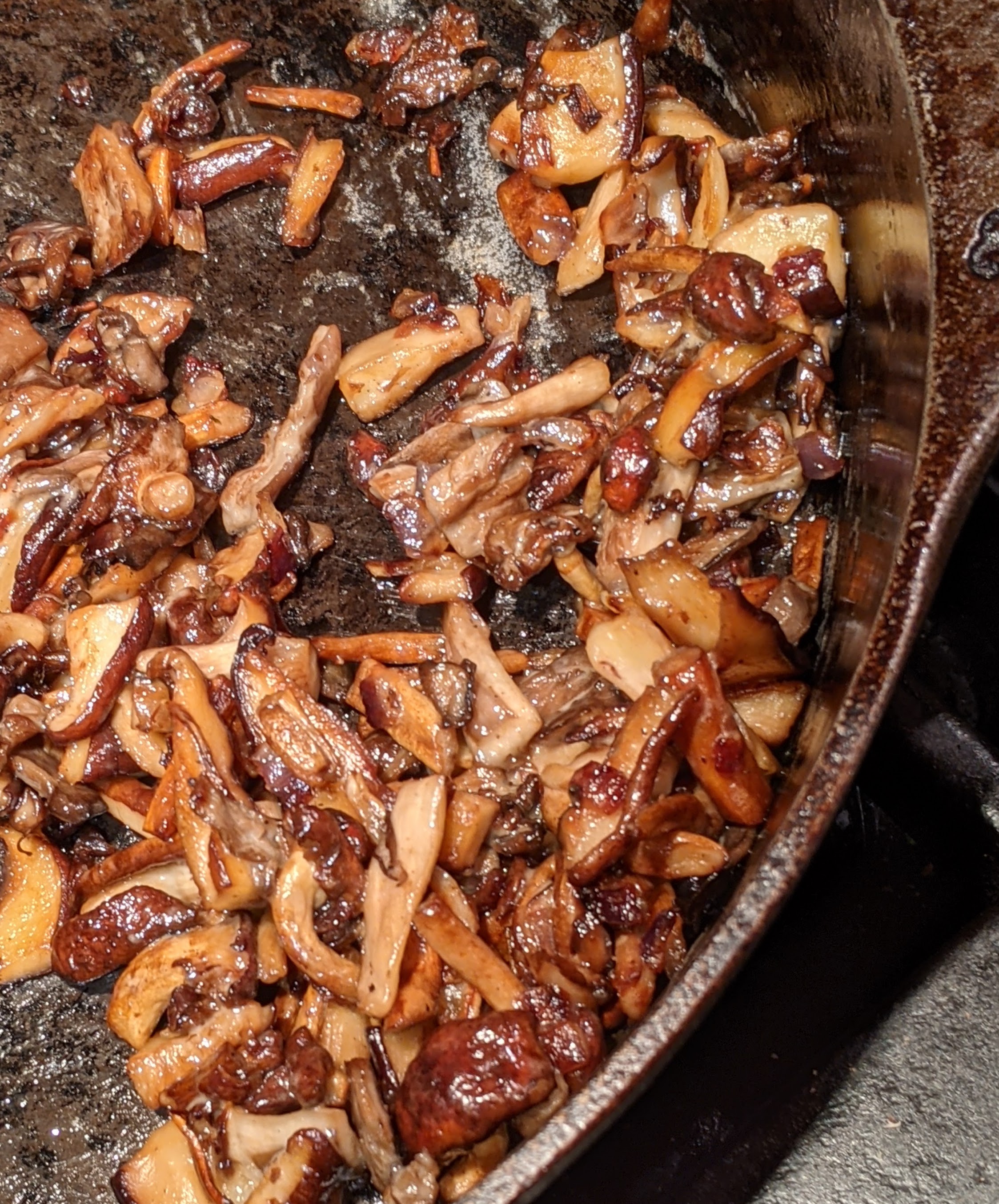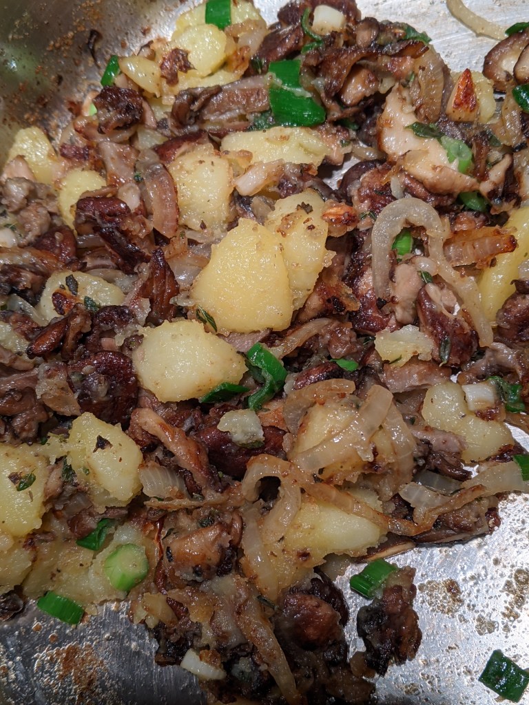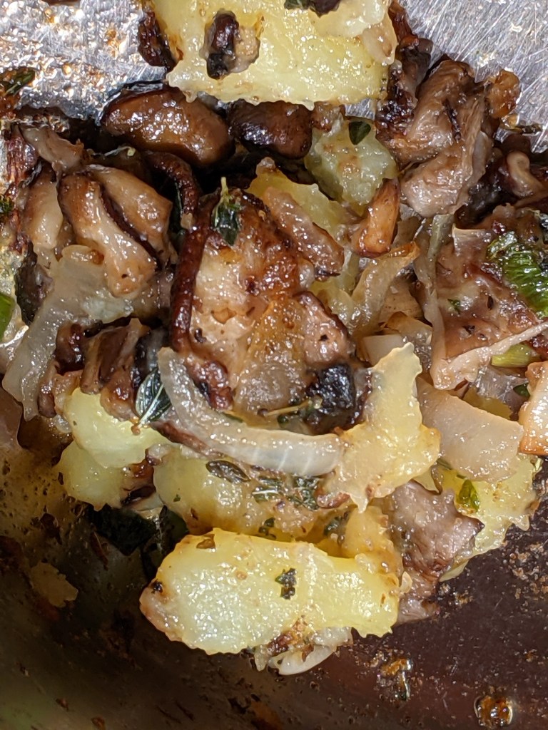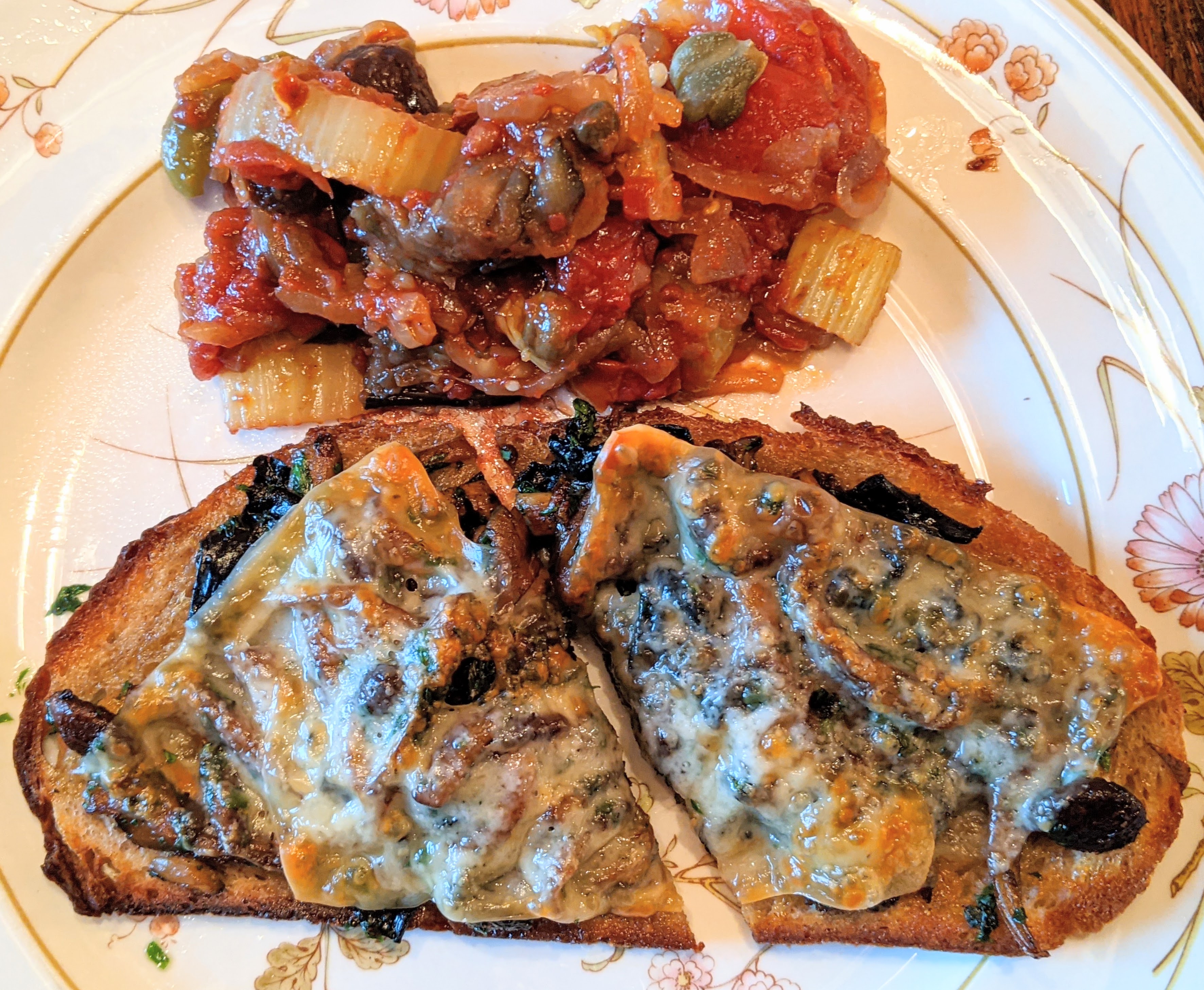 Lunch that day was marvelous. I had made my favorite Caponata (Romagnoli’s version) the day before, so it was easy to pan-fry a slice of my sourdough, sautée a mixture of wild mushrooms, add a little leftover cooked spinach, and top it all with slices of Manchego cheese. A few minutes under the broiler and lunch was ready.