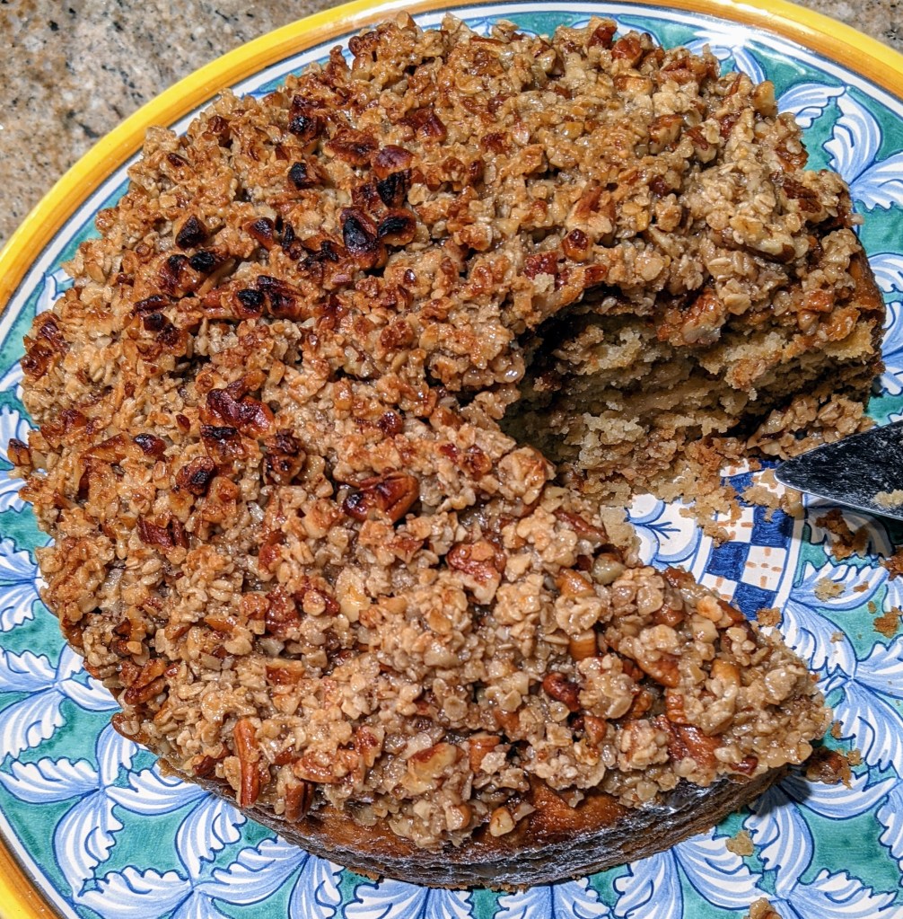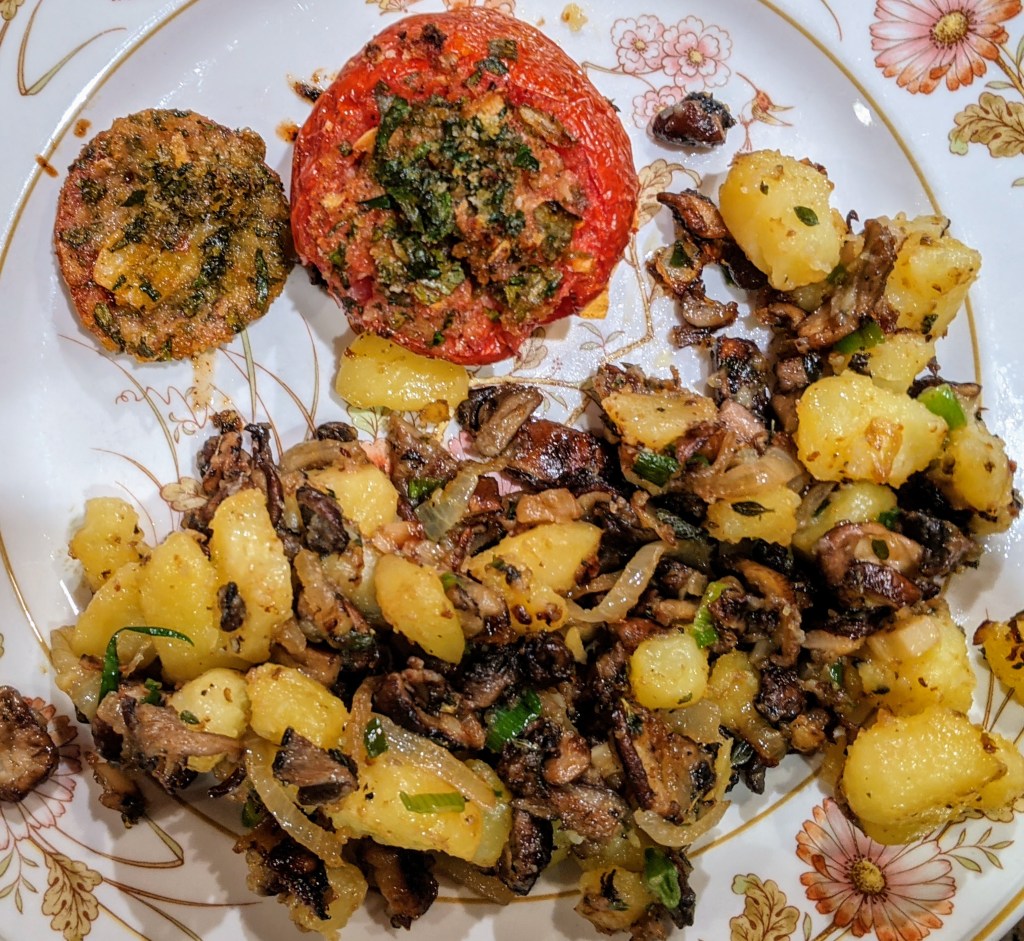 Here’s one that started with the creation of the Leek and Kale (Cavolo Nero) soup, featured roasted Provencal tomatoes, a delicious mushroom and potato sauté, and then finished with a superb Sticky Oat Cake for dessert.